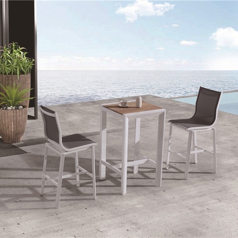 높은 좌석 알루미늄 바 의자 및 테이블 4 좌석 높은 의자 의자 호텔 정원 안뜰 선술집 옥외 가구 막대기 세트
